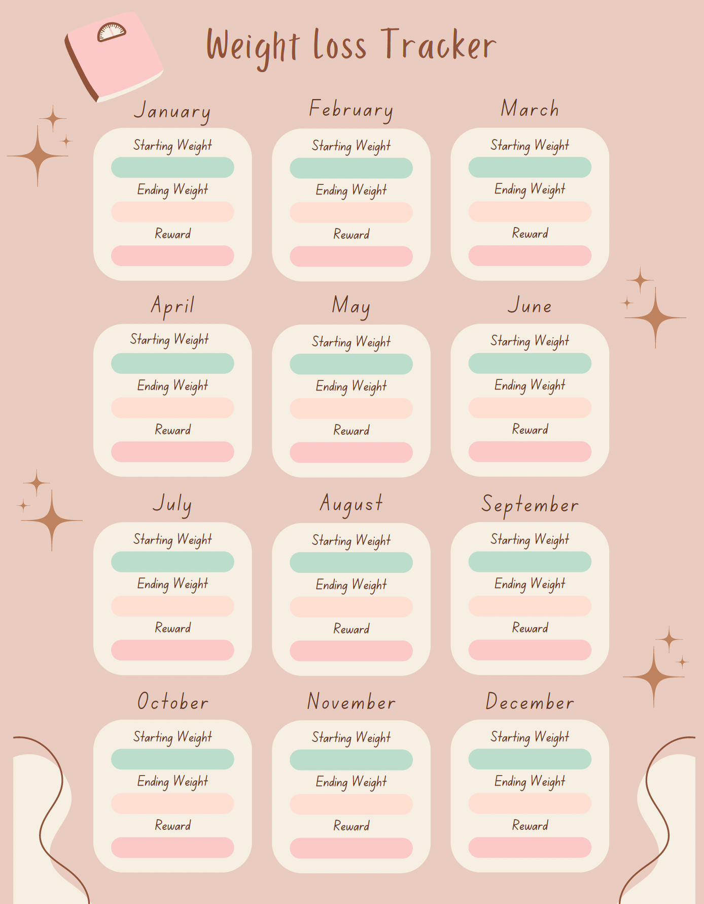 A simple, one-page yearly weight loss tracker designed to help you stay accountable, motivated, and focused—without overwhelm.